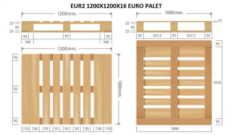 EPAL 2 olarak adlandırılan paletlerimiz 120 x 100 CM boyutlarındadır.